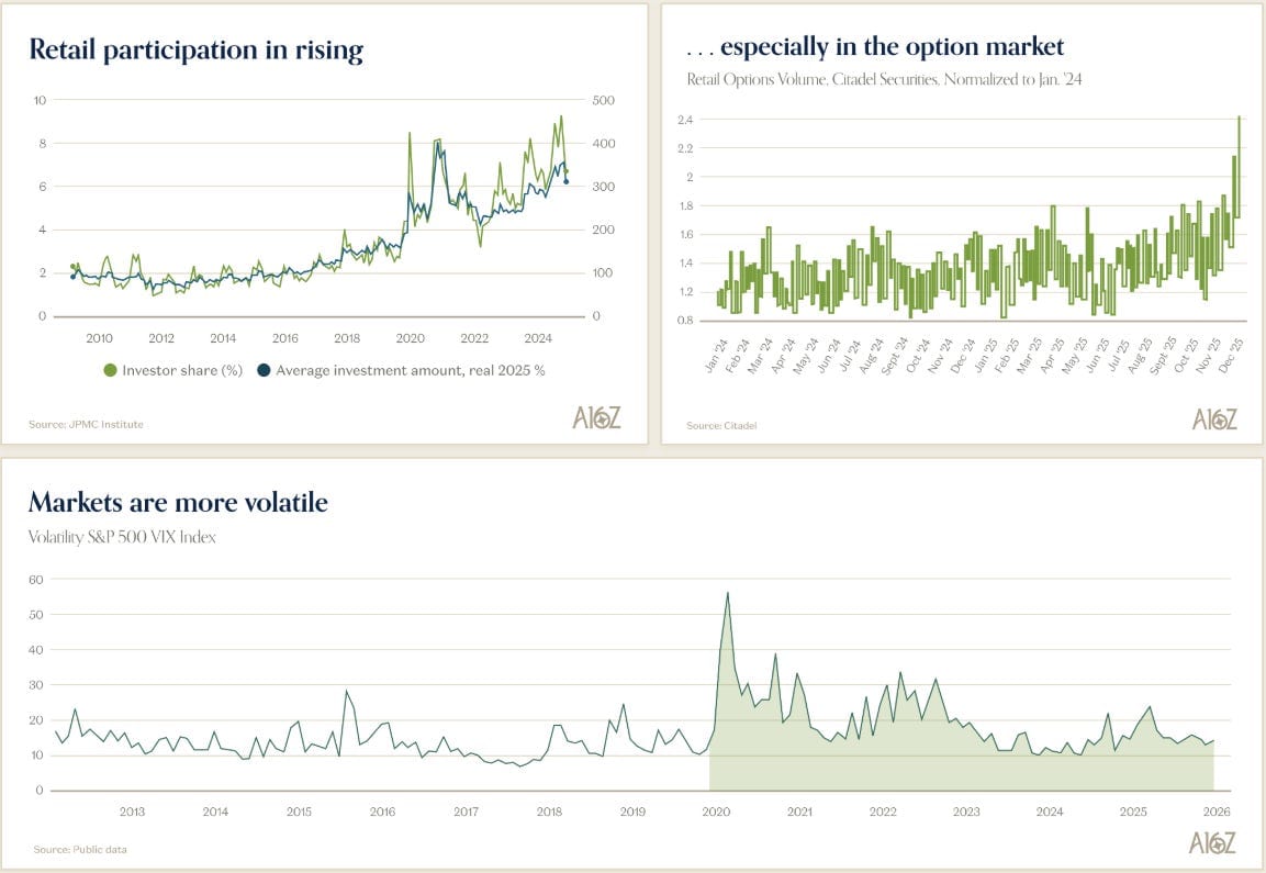 During the Dot-Com boom, access to a wide base of retail investors gave founders access to sufficient amounts of capital. But, private equity AUM over the last decade has risen to $12 trillion and is expected to double to $25 trillion over the next decade. The influx of capital to the private markets has allowed startups to stay private for longer and facilitate more value creation in private markets. You can also point to rising interest rates as another factor keeping companies stashed away in the private markets. Rising rates mean a higher discount rate baked into financial models, which disproportionately affects startups whose value largely stems from future cash flows, as opposed to profitable companies with large cash flows in the near-term. Since 2021, the majority of billion-dollar deals have shifted to the private side. Increased volatility has also chipped away at the attractiveness of public markets. Below are charts from a16z’s State of the Markets slide deck that help visualize the increase in post-COVID volatility.